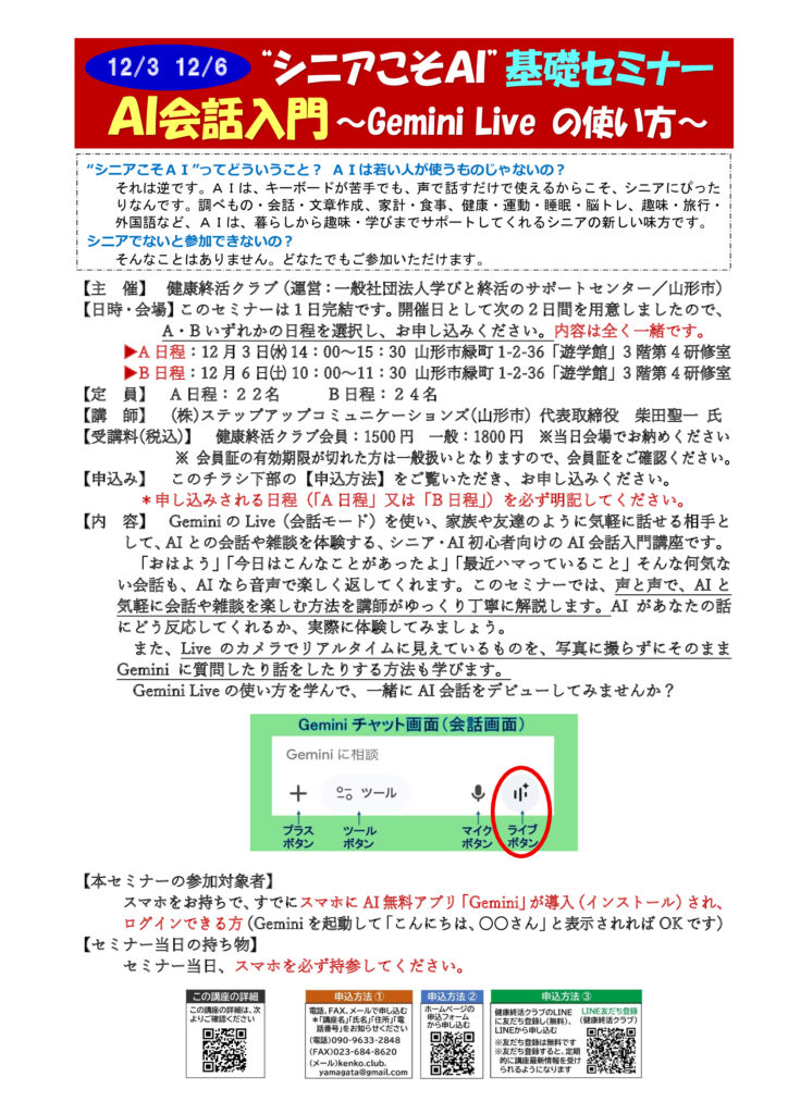 | 講座名 | “シニアこそAI”基礎セミナー「AI会話入門 ~Gemini Live の使い方~」 |
