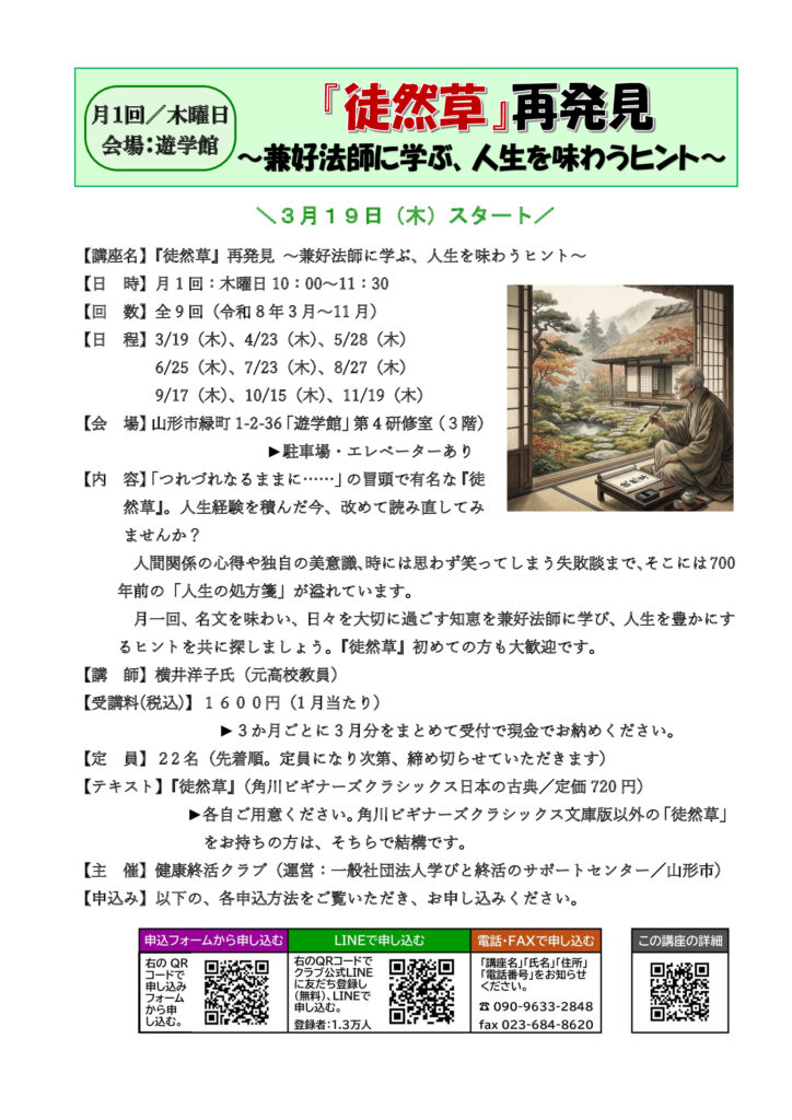 | 講座名 | 『徒然草』再発見 〜兼好法師に学ぶ、人生を味わうヒント〜 |